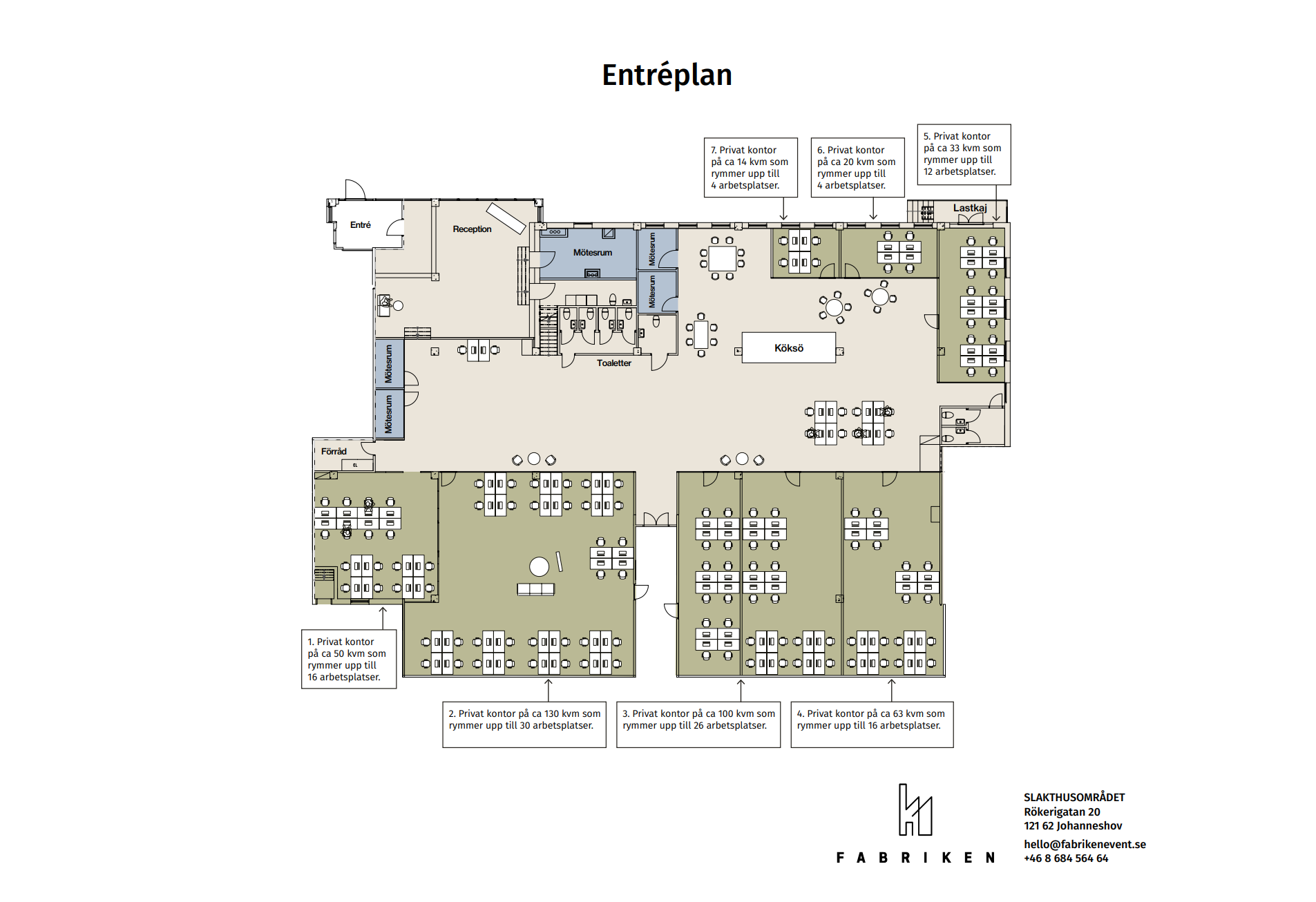 Ny finns det chans att förhyra 2 större rum som totalt utgör ca 163 kvm på Fabriken - Globen Rummen är fullt möblerade och plats för ca 40 personer, avser lokal 3 & 4 på ritningen. Fabriken erbjuder gemensam reception, gemensamt pentry med tillgång till kyl/fry, fritt kaffe och te, bud och posthantering samt fria mötesrum. Gott om parkering finns i området. Större konferensrum kan förhyras till ett reducerat pris. Hyra 152 000 kr/månad. Moms tillkommer Bilderna i annonsen är exempelbilder från olika miljöer på Fabriken