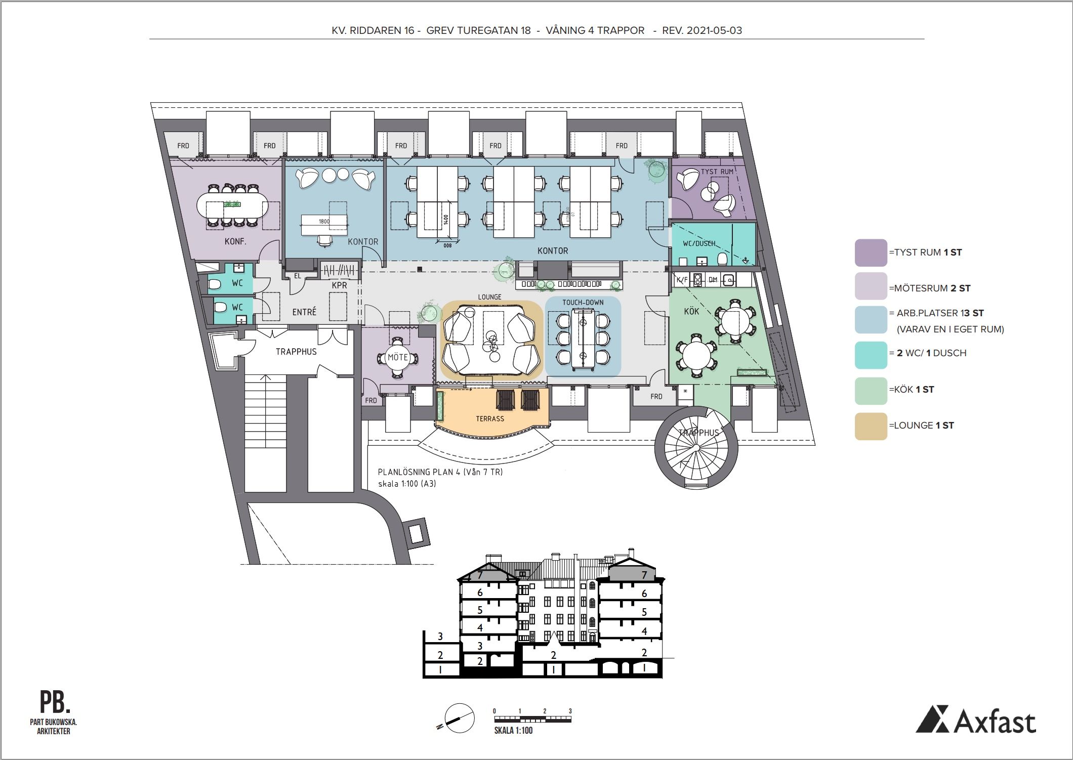 Välkommen till Riddaren 16, en stilfull fastighet strategiskt belägen mittemot Sturegallerian och bredvid den välkända restaurangen Grodan. Här har du all tänkbar service precis utanför dörren. På plan 6 finns fem rum i fil med stora, ljusa fönster mot Grev Turegatan. Alla rum har dubbeldörrar för att skapa extra rymd vid behov. Det finns även ett välutrustat konferensrum och 1-2 mötesrum för 4-5 personer. Trevligt pentry och tre wc varav en med dusch. Plan 7 erbjuder en exklusiv vindsvåning med egen terrass. Här inkluderas en öppen arbetsyta, ett rymligt konferensrum, mötesrum och ett samtalsrum. Ytterligare ett rum kan användas som mötesrum eller kontor beroende på era behov. Centralt i lokalen finns en imponerande loungeyta med högt i tak och direkt tillgång till terrassen, vilket skapar en perfekt social yta och tillfälliga arbetsplatser för dina anställda. Perfekt att ha som en extern del för kunder och andra besökare. Här finns också ett trevligt pentry och totalt tre wc, varav en med dusch. Lokalen är ljus, rymlig och utrustad med mekanisk ventilation och kyla för att garantera ett behagligt klimat året runt. Lokalen kan även fräschas upp i samråd med nästa hyresgäst. Välkommen på visning!